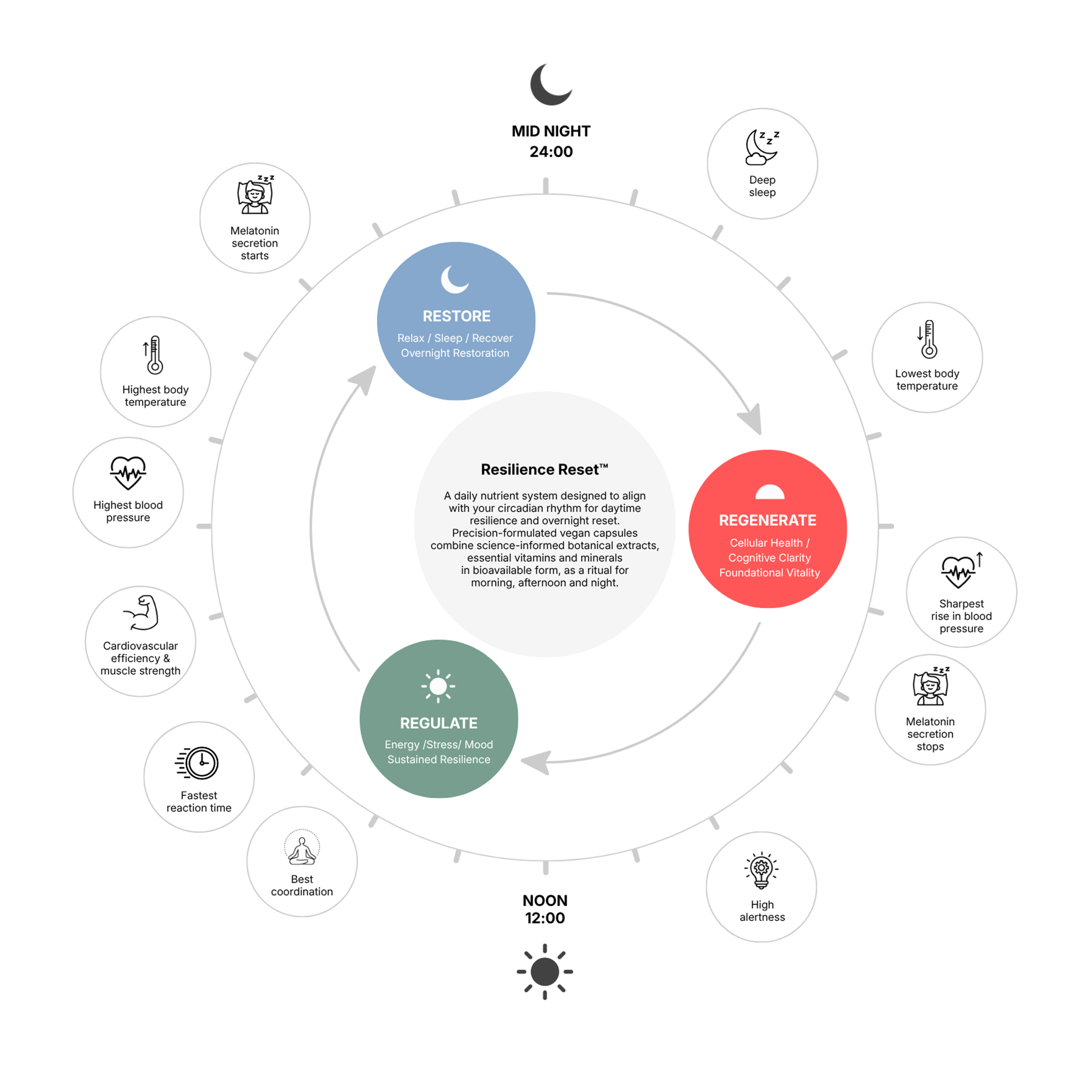 By aligning precisely-formulated nutrient combinations with these natural cycles, our Resilience Reset™ system supports consistency in how you feel and function throughout the day.
